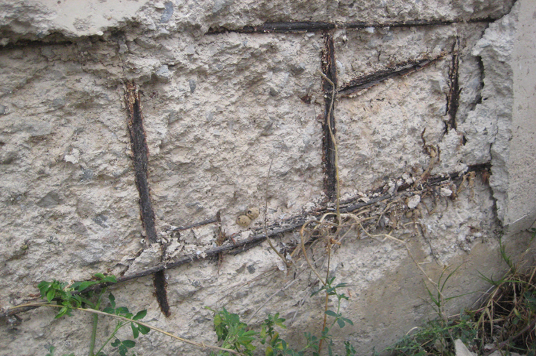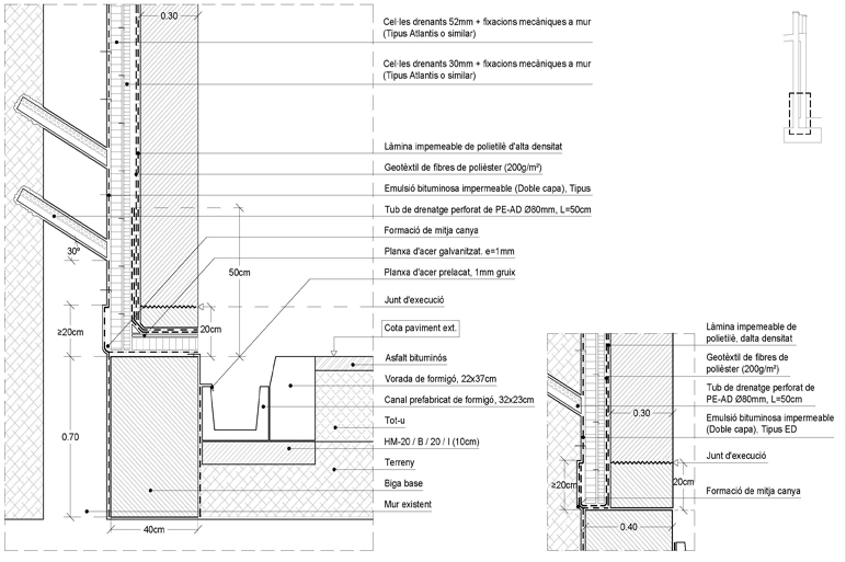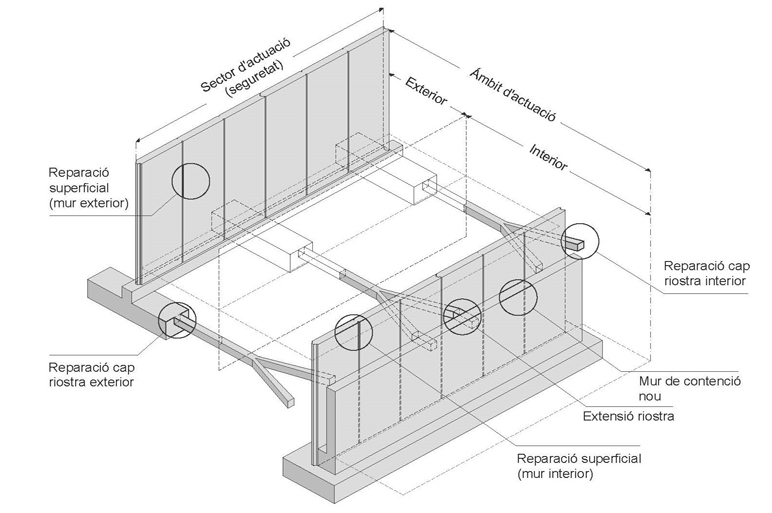 Como consecuencia de la falta de drenaje en los muros, y de la presencia de agua, éstos se encuentran en un estado de deterioro importante. El principal problema de la actuación es la existencia de diversos elementos enterrados, motivo por el cual se ha de llevar a cabo una solución que conlleve el mínimo movimiento de tierras. Se repara superficialmente todo el muro, pero sin realizar ningún drenaje en el muro interior. Como solución, se opta por perforar puntualmente el muro de contención para que deje drenar el agua del terreno y se ejecuta un muro nuevo delante conectado a la cimentación, con propiedades drenantes.